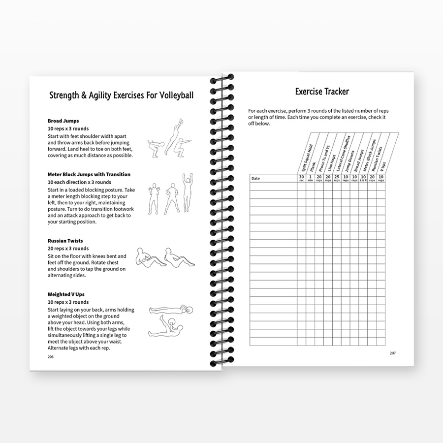 - Strength & Agility Exercises: Ten volleyball-specific exercises with illustrations, descriptions, and a QR code linking to video demonstrations, plus a tracker to help players stay consistent with the exercises.