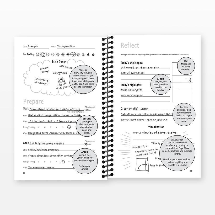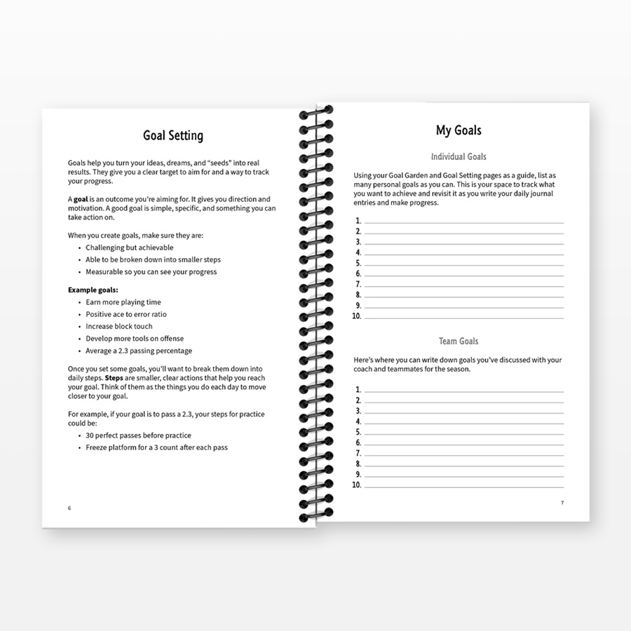This journal gives players a structured, season-long system for improving their skills, mindset, and habits—on and off the court. It blends goal-setting, reflection, visualization, and performance tracking into one easy-to-use tool created specifically for young volleyball athletes. Here’s what’s inside the journal: